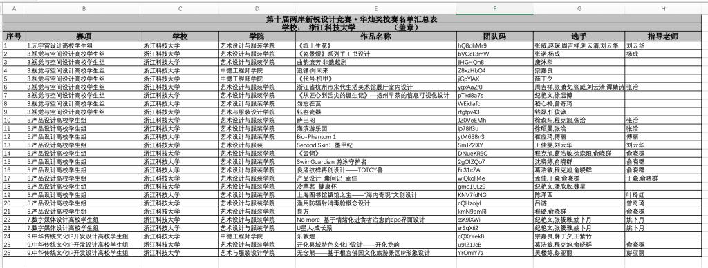 2025年第十届两岸新锐设计竞赛·华灿奖(创意赛道)校赛于2025年10月11日圆满结束,参赛队数52支,参赛人数126人,现将拟选送省赛的名单公示如下,欢迎广大老师、同学监督。如有异议,请于10月20日前与校赛负责人张老师联系,联系电话:13906516976。