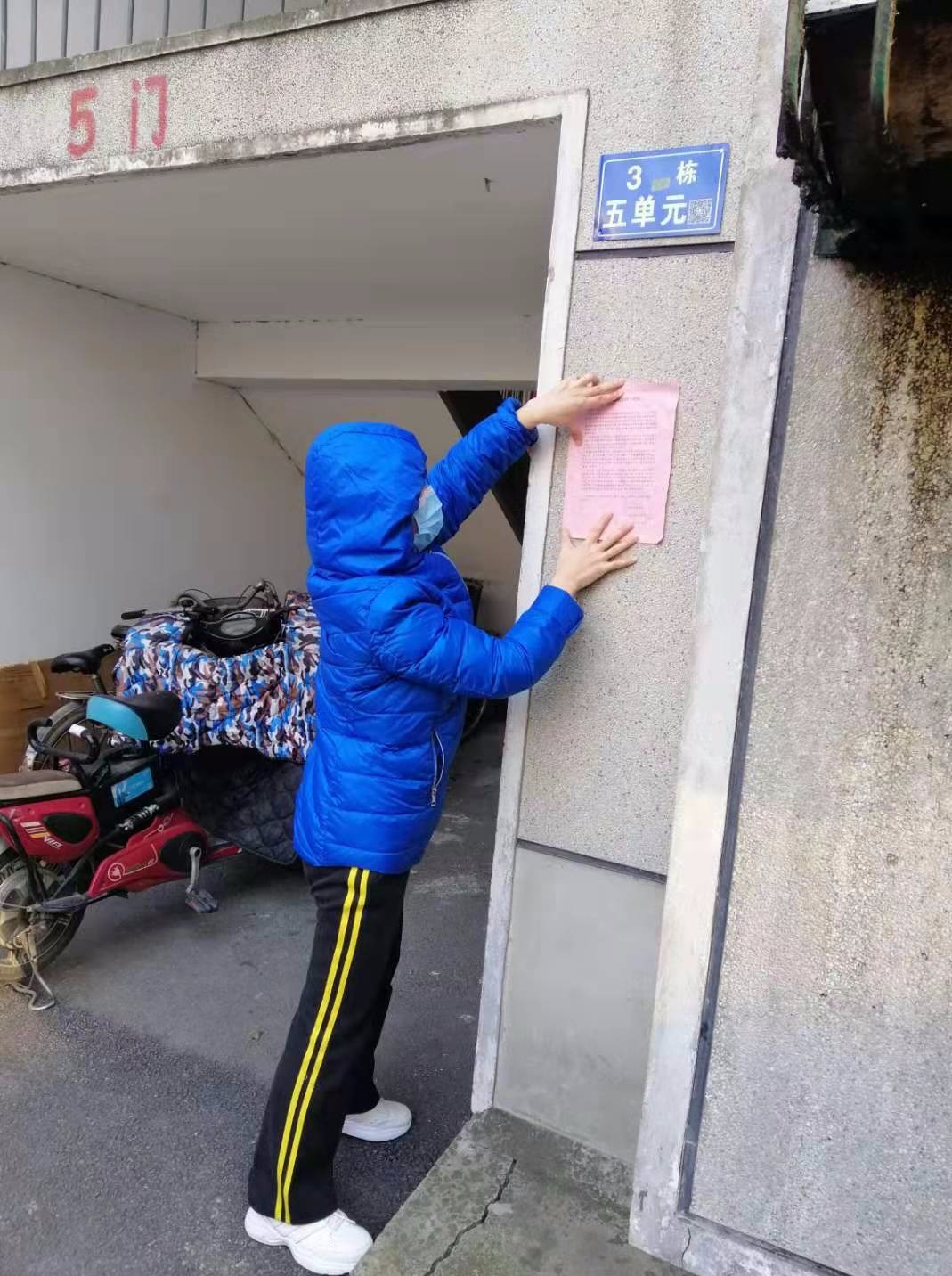 宋眉在小区张贴宣传单