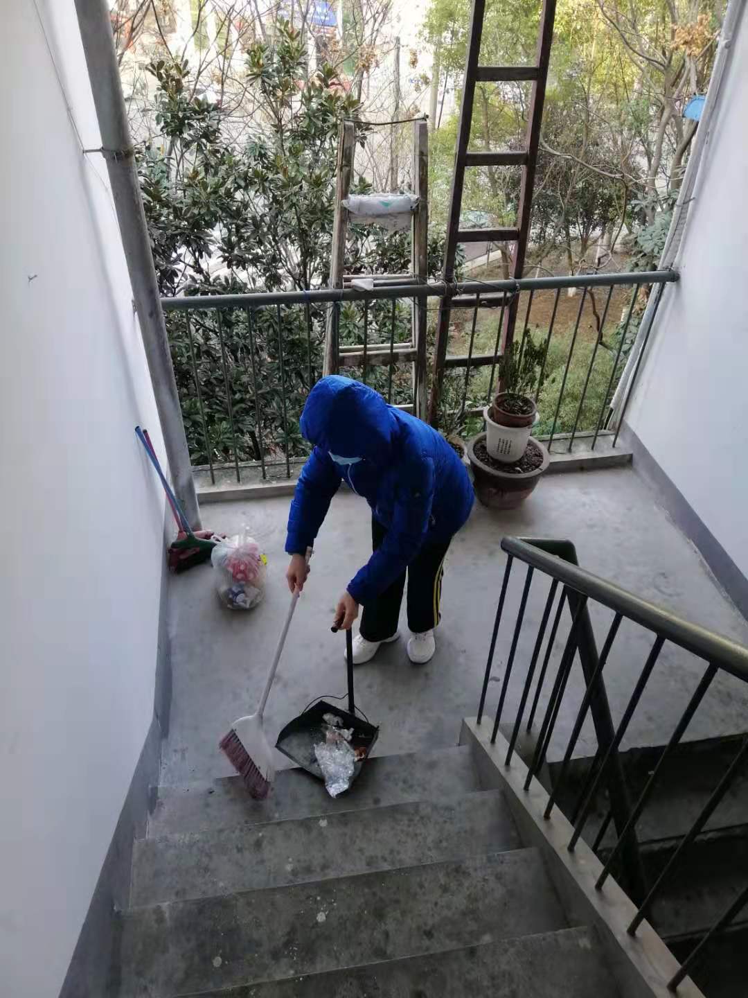 宋眉在楼道清理垃圾