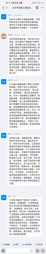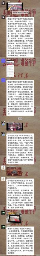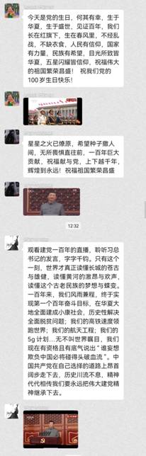 七月一日上午八点整,庆祝中国共产党成立100周年大会在北京天安门广场隆重举行。学院党委班子和师生党员代表观看直播,并组织师生通过支部组织生活会、系部政治理论学习等形式多层次、多途径观看大会,认真聆听习近平总书记在庆祝中国共产党成立100周年大会上的重要讲话,共同庆祝中国共产党成立100周年。期间,师生们在群里纷纷为党的生日献上诚挚的祝福并书写下自己的心得体会。